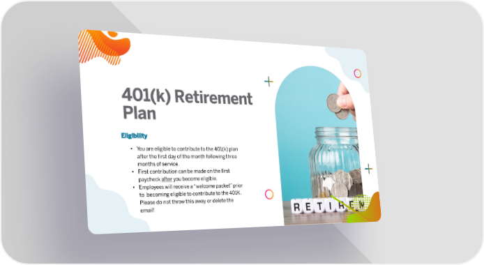401(k)Retirement Plan Eligibility • You are eligible to contribute to the 401(k) plan after the first day of the month following three months of service. • First contribution can be made on the first paycheck afteryou becomeeligible. • Employeeswill receive a “welcome packet” prior to becoming eligible to contribute to the 401K. Please do not throw this away or delete the email!