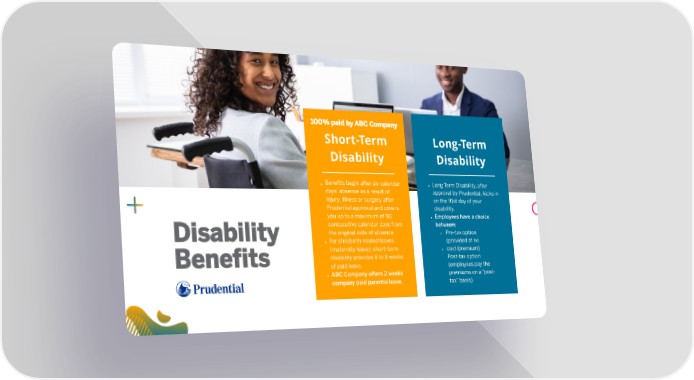 100% paid byABC Company Short-Term Long-Term Disability Disability Benefits begin after six calendar Long Term Disability, after days’ absence as a result of approval by Prudential, kicks in injury, illness or surgery after on the 91st day of your Prudential approval and covers disability. you up to a maximum of 90 Employees have achoice consecutive calendar days from between: Disability the original date ofabsence Pre-tax option For childbirth related leaves (provided at no (maternity leave), short-term cost/premium) Benefits disability provides 6 to 8 weeks Post-tax option of paid leave. (employees pay the ABC Companyoffers 2 weeks premiums on a “post- company paid parentalleave. tax”basis).
