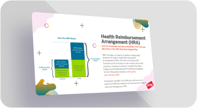HealthReimbursement How the HRAWorks Arrangement(HRA) 20 Only for employees enrolled in the BCBS PPO Preferred ABC Company Blue Plan or the HMO Blue New EnglandPlan 15 pays $4kthrough theHRA ABC Companywill pay for a portion ofdeductible 10 BCBSDeductible: expenses through a Health Reimbursement $6,000 Arrangement (HRA). The HRA is funded by ABC ABC Company Companyto help employees with medical deductible pays $2kthrough 5 theHRA Member paysthe expenses. Everyone enrolled in the HMO Blue New BCBSDeductible: first $2k of their $3,000 Member paysthe deductible England and Preferred Blue PPO $3,000 are eligible 0 first $1k of their for the HRA administered byathird-party deductible administrator,WEX. Individual Family Employees enrolled in the HRA plan will receive an email from WEX to create an online account in order to view and manage your HRA.