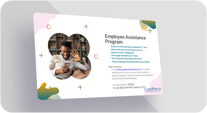 EmployeeAssistance Program • Resources and referrals available 24/7. Free and confidential counseling (4 visits in person/virtual/telephone) • Free Legal assistance (30 mins) • Free Financial Counseling (30mins) • Tips for dealing with stress and so muchmore How toAccess: Go to www.guidanceresources.comfor in-depth HelpSheetson topics you select, get answers to specific questions, search for services and referrals, and use helpful planningtools. Company Web ID:GEN311 Or call (800) 697-4327 anytime,24/7