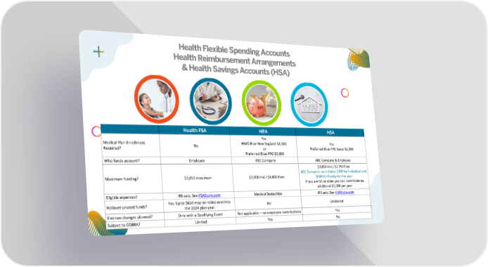 Health Flexible Spending Accounts Health Reimbursement Arrangements & Health SavingsAccounts (HSA) Health FSA HRA HSA Yes Medical Plan Enrollment No HMO Blue New England $3,000 Yes Required? or Preferred Blue PPO Saver $2,900 Preferred Blue PPO $3,000 Who funds account? Employee ABC Company ABC Company & Employee $3,850 Ind / $7,750 Fam ABC Company contributes $300 for Individual and Maximum funding? $3,050 maximum $2,000 Ind / $4,000 Fam $600 for Family for the year. If you are 55 or older you can contribute an additional $1,000 per year. Eligible expenses? IRS sets; See FSAStore.com Medical Deductible IRS sets; See HSAStore.com Rollover unused funds? Yes; Up to $610 may be rolled over into No Unlimited the 2024 plan year. Election changes allowed? Only with a Qualifying Event Not applicable – no employee contributions Yes Subject to COBRA? Limited Yes No