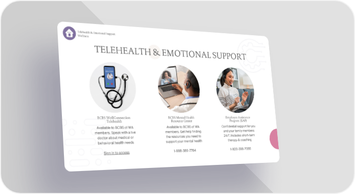Telehealth & Emotional Support home Wellness TELEHEALTH & EMOTIONAL SUPPORT BCBS WellConnection BCBS Mental Health Employee Assistance Telehealth Resource Center Program (EAP) Available to BCBS of MA Available to BCBS of MA Confidential support for you members. Speak with a live members. Get help finding and your family members doctor about medical or the resources you need to 24/7. Includes short-term behavioral health needs support your mental health therapy & coaching Sign in to access 1-888-389-7764 1-800-386-7055