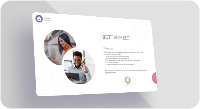 betterhelp home Wellness BETTERHELP What it is: betterhelp is the world's largest network of professional, licensed, and accredited therapists. It offers: smart matching with a licensed therapist unlimited messaging with your therapist live weekly session over chat, phone, or video with therapist Interactive webinars Digital tools such as journaling and goal tracking ABC Company will pay the full cost for any employee actively using the app each month! get started
