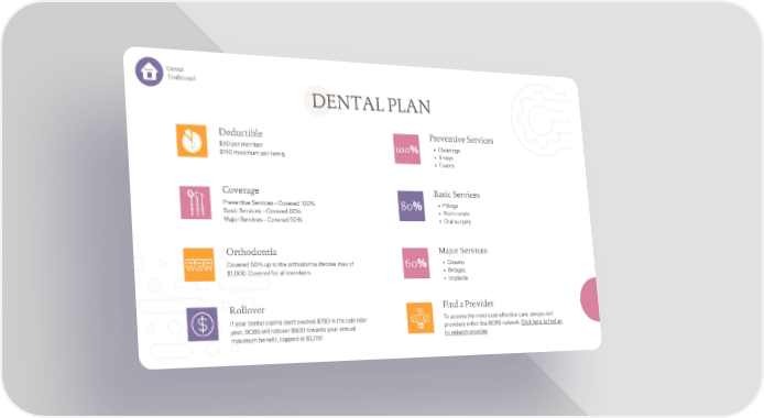 Dental home Traditional DENTAL PLAN Preventive Services Deductible Cleanings $50 per member 100% X-rays $150 maximum per family Exams Coverage Basic Services Preventive Services - Covered 100% Fillings 80% Basic Services - Covered 80% Root canals Major Services - Covered 50% Oral surgery Major Services Orthodontia Crowns Covered 50% up to the orthodontia lifetime max of 60% Bridges $1,000. Covered for all members Implants Find a Provider Rollover To access the most cost-effective care, always visit If your dental claims don't exceed $700 in the calendar providers within the BCBS network. Click here to find an year, BCBS will rollover $500 towards your annual in-network provider maximum benefit, capped at $1,250
