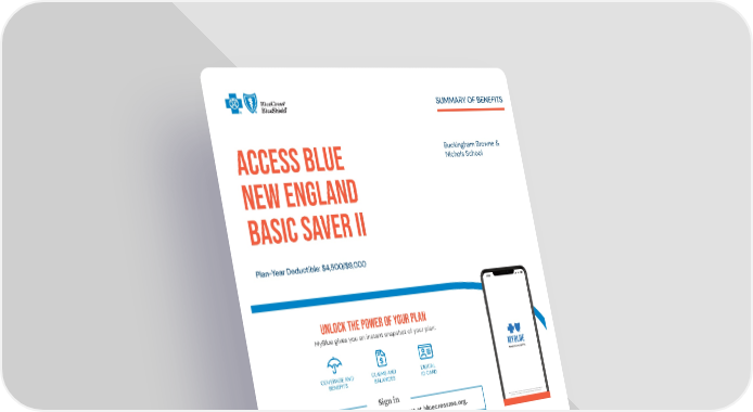 SUMMARY OF BENEFITS Buckingham Browne & Access Blue Nichols School New England basic Saver II Plan-Year Deductible: $4,500/$9,000 UNLOCK THE POWER OF YOUR PLAN MyBlue gives you an instant snapshot of your plan: COVERAGE AND CLAIMS AND DIGITAL BENEFITS BALANCES ID CARD Sign in Download the app, or create an account at bluecrossma.org. This health plan meets Minimum Creditable Coverage Standards for Massachusetts residents that went into effect January 1, 2014, as part of the Massachusetts Health Care Reform Law. An Association of Independent Blue Cross and Blue Shield Plans