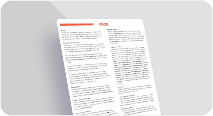 Your Care Access Telehealth Services This plan gives you the option to go directly to a specialist or any doctor in the Telehealth services are covered when the same in-person service would be HMO Blue New England network without a referral. Just show your Blue Cross covered by the health plan and the use of telehealth is appropriate. Your health Blue Shield of Massachusetts ID card and receive care. However, some services care provider will work with you to determine if a telehealth visit is medically do require authorization. See your subscriber certificate for details. appropriate for your health care needs or if an in-person visit is required. For a list of telehealth providers, visit the Blue Cross Blue Shield of Massachusetts website Primary Care Provider (PCP) at bluecrossma.org, consult Find a Doctor, or call the Member Service number When you enroll in this health plan, you must choose a primary care provider. Be on your ID card. sure to select a doctor who is accepting you and your family members as new patients and participates in our network of providers in New England. For children, Your Virtual Care Team you may designate a participating network pediatrician as the PCP. Your health plan includes the option for a tech-enabled delivery model where virtual care team covered providers furnish certain covered services, including For a list of participating PCPs or OB/GYN physicians, visit the Blue Cross primary care with integrated mental health and/or substance use care within Blue Shield of Massachusetts website at bluecrossma.org; consult Find a Doctor the patient care team, via traditional and/or digital platforms (such as: mobile at bluecrossma.com/findadoctor; or call the Member Service number on your app; web portal; telephone; and/or text message). This care delivery model ID card. offers a comprehensive and coordinated primary care experience with virtual engagement and seamless navigation to in-person care with network providers If you have trouble choosing a doctor, Member Service can help. They can give when applicable. After meeting your deductible, for outpatient covered you the doctor’s gender, the medical school the doctor attended, and whether services furnished by a designated virtual care team primary care or mental there are languages other than English spoken in the office. health care provider type, you will pay nothing (any deductible, copayment, Your provider may also work with Blue Cross Blue Shield of Massachusetts and/or coinsurance does not apply). For outpatient covered services regarding Utilization Review Requirements, including Pre-Admission Review, furnished by a virtual care team covered provider that is not a virtual care Concurrent Review and Discharge Planning, Prior Approval for Certain Outpatient team primary care or mental health care provider type, you will pay your Services, and Individual Case Management. For detailed information about applicable cost share (deductible, copayment, and/or coinsurance). To find Utilization Review, see your subscriber certificate. a virtual care team covered provider or to learn more about this care delivery model, visit MyBlue online or see “When You Need Help to Find a Health Care Your Deductible Provider” in your subscriber certificate, or call the Member Service number on Your deductible is the amount of money you pay out-of-pocket each plan your ID card. year before you can receive coverage for certain benefits under this plan. If Service Area you are not sure when your plan year begins, contact Blue Cross Blue Shield The plan’s service area includes all cities and towns in the Commonwealth of of Massachusetts. Your deductible is $4,500 per member (or $9,000 per family). Massachusetts, State of Rhode Island, State of Vermont, State of Connecticut, Your Out-of-Pocket Maximum State of New Hampshire, and State of Maine. Your out-of-pocket maximum is the most that you could pay during a plan year When Outside the Service Area for deductible, copayments (including prescription drug copayments), and If you’re traveling outside the service area and you need urgent or emergency coinsurance for covered services. Your out-of-pocket maximum is $6,450 per care, you should go to the nearest appropriate health care facility. You are member (or $12,900 per family). covered for the urgent or emergency care visit and one follow-up visit while Emergency Room Services outside the service area. See your subscriber certificate for more information. In an emergency, such as a suspected heart attack, stroke, or poisoning, Dependent Benefits you should go directly to the nearest medical f acility or call 911 (or the local This plan covers dependents until the end of the calendar month in which emergency phone number). After meeting your deductible, you pay a copayment they turn age 26, regardless of their financial dependency, student status, or per visit for emergency room services. This copayment is waived if you are employment status. See your subscriber certificate (and riders, if any) for exact admitted to the hospital or for an observation stay. See the chart for your coverage details. cost share. Domestic Partner Coverage Domestic partner coverage may be available for eligible dependents. Contact your plan sponsor for more information.