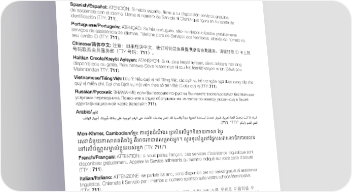 Translation Resources TRANSLATION RESOURCES Proficiency of Language Assistance Services Proficiency of Language Assistance Services Spanish/Español: ATENCIÓN: Si habla español, tiene a su disposición servicios gratuitos de asistencia con el idioma. Llame al número de Servicio al Cliente que figura en su tarjeta de identificación (TTY: 711). Portuguese/Português: ATENÇÃO: Se fala português, são-lhe disponibilizados gratuitamente serviços de assistência de idiomas. Telefone para os Serviços aos Membros, através do número no seu cartão ID (TTY: 711). Chinese/简体中文: 注意:如果您讲中文,我们可向您免费提供语言协助服务。请拨打您 ID 卡上的 号码联系会员服务部(TTY 号码:711)。 Haitian Creole/Kreyòl Ayisyen: ATANSYON: Si ou pale kreyòl ayisyen, sèvis asistans nan lang disponib pou ou gratis. Rele nimewo Sèvis Manm nan ki sou kat Idantitifkasyon w lan (Sèvis pou Malantandan TTY: 711). Vietnamese/Tiếng Việt: LƯU Ý: Nếu quý vị nói Tiếng Việt, các dịch vụ hỗ trợ ngôn ngữ được cung cấp cho quý vị miễn phí. Gọi cho Dịch vụ Hội viên theo số trên thẻ ID của quý vị (TTY: 711). Russian/Русский: ВНИМАНИЕ: если Вы говорите по-русски, Вы можете воспользоваться бесплатными услугами переводчика. Позвоните в отдел обслуживания клиентов по номеру, указанному в Вашей идентификационной карте (телетайп: 711). Arabic/برية: فتاهلا زاهج) كتيوه ةقاطب لىع دوجولما مقرلا لىع ءاضعلأا تامدخب لصتا كل ةبسنلاب اناجم ةيوغللا ةدعاسلما تامدخ رفوتتف ،ةيبرعلا ةغللا ثدحتت تنك اذإ ”هابتنا ُ ً .(711 :”TTY“ مكبلاو مصلل صينلا Mon-Khmer, Cambodian/ខ្មែរ: ការជនដណង៖ ូ ំ ឹ ប្រសិនប្រអ្នកនើ ិយាយភាសា ខ្មែរ ំ ួ ិ ឺ ់ ូ ូ ័ ្ន ិ បសវាជនយភាសាឥតគតថ្លៃ គអាចរកបានសបរា្រអ្នក។ សមទរសព្ទបៅខ្កបសវាសរាជកតាមបេ្ បៅបេើ្រ័ណ្ណ សរាេ្លៃគា ់ នរ្រសអ្នក់ (TTY: 711)។ ួ French/Français: ATTENTION : si vous parlez français, des services d’assistance linguistique sont disponibles gratuitement. Appelez le Service adhérents au numéro indiqué sur votre carte d’assuré (TTY : 711). Italian/Italiano: ATTENZIONE: se parlate italiano, sono disponibili per voi servizi gratuiti di assistenza linguistica. Chiamate il Servizio per i membri al numero riportato sulla vostra scheda identificativa (TTY: 711). Korean/한국어: 주의: 한국어를 사용하시는 경우, 언어 지원 서비스를 무료로 이용하실 수 있습니다. 귀하의 ID 카드에 있는 전화번호(TTY: 711)를 사용하여 회원 서비스에 전화하십시오. Greek/λληνικά: ΠΡΟΣΟΧΗ: Εάν μιλάτε Ελληνικά, διατίθενται για σας υπηρεσίες γλωσσικής βοήθειας, Greek/Eλληνικά: ΠΡΟΣΟΧΗ: Εάν μιλάτε Ελληνικά, διατίθενται για σας υπηρεσίες γλωσσικής βοήθειας, δωρεάν. Καλέστε την Υπηρεσία Εξυπηρέτησης Μελών στον αριθμό της κάρτας μέλους σας (ID Card) δωρεάν. Καλέστε την Υπηρεσία Εξυπηρέτησης Μελών στον αριθμό της κάρτας μέλους σας (ID Card) (TTY: 711). (TTY: 711). Blue Cross Blue Shield of Massachusetts is an Independent Licensee of the Blue Cross and Blue Shield Association Blue Cross Blue Shield of Massachusetts is an Independent Licensee of the Blue Cross and Blue Shield Association.