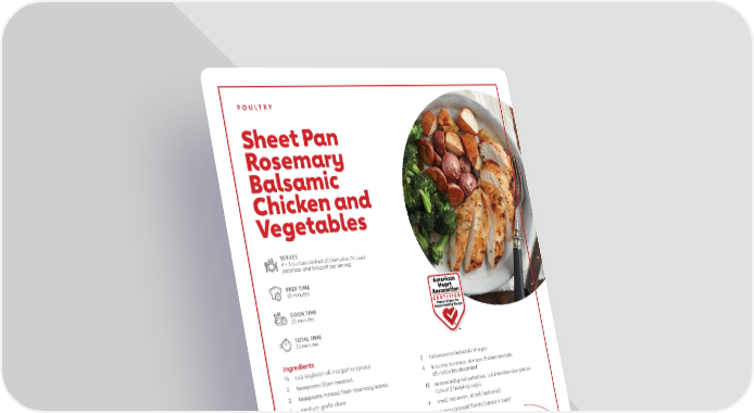POULTRY Sheet Pan Rosemary Balsamic Chicken and Vegetables SERVES 4 • 3 ounces cooked chicken plus 11/2 cups potatoes and broccoli per serving PREP TIME 10 minutes COOK TIME 25 minutes TOTAL TIME 35 minutes Ingredients ¼ cup soybean oil margarine spread 2 tablespoons balsamic vinegar 2 teaspoons Dijon mustard 4 4-ounce boneless, skinless chicken breasts, 2 teaspoons minced fresh rosemary leaves all visible fat discarded 1 medium garlic clove 12 ounces baby red potatoes, cut into bite-size pieces (about 2 heaping cups) ¼ teaspoon salt 1 small red onion, sliced (optional) ¼ teaspoon coarsely ground black pepper 12 ounces broccoli florets (about 4 cups) Directions 1 . Preheat the oven to 425°F . Line a large baking sheet with Nutrition Analysis (per serving) shallow sides with aluminum foil . Calories 190 2 . In a small bowl, stir together the margarine spread, Total Fat 7 .0 g mustard, rosemary, garlic, salt and pepper . Gradually Saturated Fat 2.0 g whisk in the balsamic vinegar until blended . Trans Fat 0.0 g Polyunsaturated Fat 3.5 g 3 . Spread 2 tablespoons of the mixture over the chicken . Monounsaturated Fat 1.5 g Toss the potatoes and onion if desired with the Cholesterol 20 mg 2 tablespoons until evenly coated . Toss the broccoli with Sodium 350 mg the remaining 2 tablespoons mixture until evenly coated . Carbohydrates 20 g 4 . Place the chicken, potatoes and broccoli on the baking Fiber 4 g sheet . Cook for 25 minutes, or until the chicken is cooked Total Sugars 4 g through (no longer pink in the center and registers 165˚F on Protein 11 g an instant-read thermometer) and vegetables are tender . Dietary Exchanges 5 . Transfer the chicken, potatoes and broccoli to a serving 1 starch, 1 vegetable, 3 lean meat platter . Drizzle with any pan juices . This recipe from I Can’t Believe It’s Not Butter is an American Heart Association Heart-Check Certified Recipe. 13