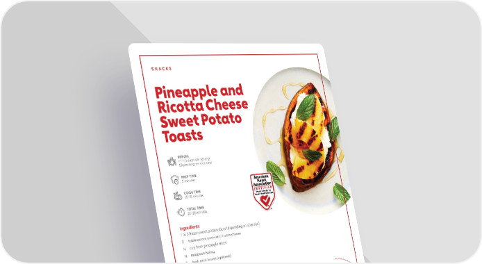 SNACKS Pineapple and Ricotta Cheese Sweet Potato Toasts SERVES 1 • 1–3 slices per serving (depending on slice size) PREP TIME 5 minutes COOK TIME – 15 18 minutes TOTAL TIME – 20 23 minutes Ingredients 1 to 3 frozen sweet potato slices (depending on slice size) 2 tablespoons part-skim ricotta cheese ¼ cup fresh pineapple slices ¼ teaspoon honey 2 fresh mint leaves (optional) Directions 1 . Preheat the oven to 425°F . 2 . Arrange the frozen sweet potato slices on a baking sheet . 3 . Bake for 15 to 18 minutes, or until the slices are tender and easily pierced with a fork or until heated through at Nutrition Analysis (per serving) desired consistency . Calories 141 4 . Meanwhile, grill the pineapple slices on high heat for Total Fat 1 .5 g 2 to 3 minutes per side, or until grill marks appear . Saturated Fat 1.0 g Remove from the heat . Set aside . Trans Fat 0.0 g 5 . Carefully remove the baking sheet from the oven . Polyunsaturated Fat 0.0 g Monounsaturated Fat 0.0 g 6 . Top the potato slices with the ricotta cheese and grilled Cholesterol 8 mg pineapple . Drizzle with the honey . Garnish with the mint Sodium 58 mg leaves if desired . Carbohydrates 28 g Fiber 4 g Total Sugars 14 g Protein 5 g Dietary Exchanges 2 starch This recipe from CAULIPOWER is an American Heart Association Heart-Check Certified Recipe. 7