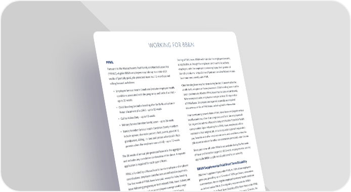 WORKING FOR BB&N PFML During a PFML leave, BB&N will maintain the employee’s bene昀椀ts, Pursuant to the Massachusetts Paid Family and Medical Leave Act as applicable, as though the employee continued to be actively (“PFML”), eligible BB&N employees may take up to a total of 26 employed, with the employee continuing to pay their portion of weeks of partially paid, job-protected leave in a 12-month period bene昀椀t premiums. Unpaid time o昀昀 pursuant to other federal or state rolling forward as follows: laws runs concurrently with PFML. • Employee Serious Health Condition (includes employee health Child bonding leave may be taken during the 昀椀rst 12 months after the conditions associated with the pregnancy and birth of a child) – child’s birth, adoption or foster placement. Child bonding leave must be up to 20 weeks taken continuously. All other PFML leave may be taken intermittently. Whenever practicable, employees must give at least 30-days notice • Child Bonding (includes bonding after the birth, adoption or of PFML leave. Employees are required to provide any required foster placement of a child) - up to 12 weeks documentation for a PFML leave, including health information. • Call to Active Duty – up to 12 weeks Prior to returning to work from a PFML leave for an employee’s serious • Military Service Member Family Leave – up to 26 weeks health condition, other than pregnancy and birth, the employee will • Family Member Serious Health Condition (family members be required to submit a 昀椀tness for duty certi昀椀cation from their health include spouse, domestic partner, child, parent, grandchild, care provider. Upon returning from PFML leave, employees will be grandparent, sibling, in-laws and person who stood in loco restored to their original job, or to an equivalent job with equivalent parentis when the employee was a child) – up to 12 weeks pay, bene昀椀ts and other employment terms and conditions unless the job ceases to exist or for other considerations permitted under the law. The 26 weeks of annual job-protected leave is in the aggregate and includes any cumulative combination of the above. A separate Since paid-time-o昀昀 under PFML is not available during the 昀椀rst week application is required for each type of leave. of leave and thereafter capped at $850/week, employees may use any applicable BB&N supplemental paid bene昀椀ts concurrently. PFML is funded by a Massachusetts tax via employer and employee contributions. Employee contributions are re昀氀ected in paychecks. BB&N Supplemental Paid Short Term Disability The 昀椀rst week of PFML leave is unpaid, except for baby bonding BB&N will supplement pay under PFML to 100% of an employee’s leave following pregnancy or birth related PFML leave. Subsequent gross pay, providing up to 12 weeks of 100% paid leave, consecutive weeks are paid based on an employee’s average weekly wage or intermittent, for an eligible employee’s personal health condition according to a calculator up to a maximum of $850/week. as de昀椀ned under FMLA. The eligibility requirements for BB&N Supplemental Paid Short Term Disability di昀昀er from those under PFML. Speci昀椀cally, to be eligible to receive 100% pay for up to 12 weeks, the employee must: (1) have completed at least 12 months of employment and 1,250 hours of work; (2) be actively employed, actually working, and bene昀椀ts eligible; (3) not have received 12 weeks paid leave under any other BB&N supplemented policy within the last 12 months. This supplemental paid bene昀椀t is not available for periods that an employee is not normally working, such as school breaks and vacation for faculty. BB&N Supplemental Paid Child Bonding Leave BB&N will supplement pay under PFML for child bonding to 100% of an employee’s gross pay, providing up to 8 weeks of 100% paid - 14 -