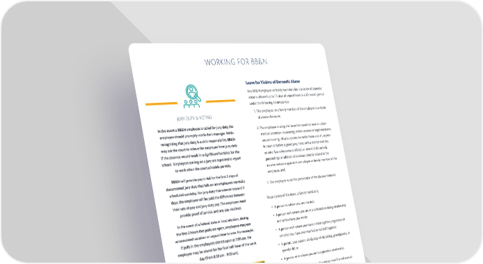 WORKING FOR BB&N Leave for Victims of Domestic Abuse Any BB&N employee or family member who is a victim of domestic abuse is allowed up to 15 days of unpaid leave in a 12-month period under the following circumstances: JURY DUTY & VOTING 1. The employee, or a family member of the employee is a victim of abusive behavior; In the event a BB&N employee is called for jury duty, the 2. The employee is using the leave from work to: seek or obtain employee should promptly notify their manager. While medical attention, counseling, victim services or legal assistance, recognizing that jury duty is a civic responsibility, BB&N secure housing, obtain a protective order from a court, appear may ask the court to relieve the employee from jury duty in court or before a grand jury, meet with a district attorney if the absence would result in a signi昀椀cant hardship for the or other law enforcement o昀케cial, or attend child custody school. Employees serving on a jury are expected to report proceedings or address other issues directly related to the to work when the court schedule permits. abusive behavior against the employee or family member of the BB&N will provide pay in full for the 昀椀rst 3 days of employee, and; documented jury duty that falls on an employee’s normally scheduled workday. For jury duty that extends beyond 3 3. The employee is not the perpetrator of the abusive behavior. days, the employee will be paid the di昀昀erence between their rate of pay and jury duty pay. The employee must For purposes of this leave, a family member is: provide proof of service and any pay received. • A person to whom you are married; In the event of a federal state or local election, during • A person with whom you are in a substantive dating relationship the 昀椀rst 2 hours that polls are open, employees may use and with whom you reside; accumulated vacation or unpaid time to vote. For example, • A person with whom you have a child together, regardless of if polls in the employee’s district open at 7:00 am, the whether you have ever married or resided together; employee may be absent for the 昀椀rst half-hour of the work day (from 8:30 am - 9:00 am). • A parent, step-parent, child, step-child, sibling, grandparent, or grandchild; or • A person with whom you are in a guardian relationship. An employee seeking leave under this policy must 昀椀rst exhaust all paid time o昀昀, including vacation, sick and personal time. - 17 -