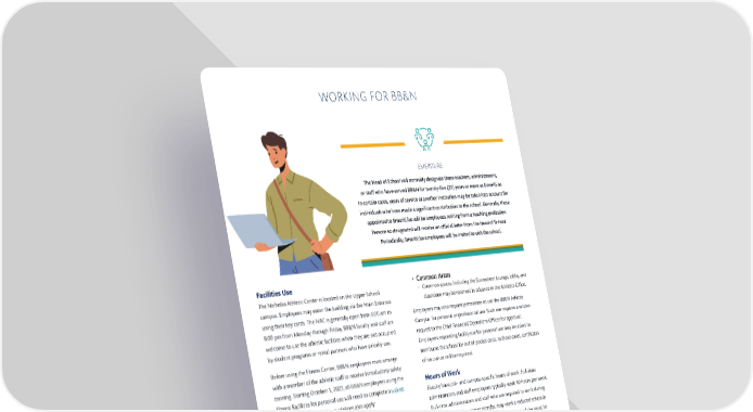 WORKING FOR BB&N EMERITI/AE The Head of School will normally designate those teachers, administrators, or sta昀昀 who have served BB&N for twenty-昀椀ve (25) years or more as Emeriti/ae. In certain cases, years of service at another institution may be taken into account for individuals who have made a signi昀椀cant contribution to the school. Generally, those appointed to Emeriti/ae will be employees retiring from a teaching profession. Persons so designated will receive an o昀케cial letter from the Head of School. Periodically, Emeriti/ae employees will be invited to visit the school. Facilities Use • Common Areas The Nicholas Athletic Center is located on the Upper School - Common spaces, including the Stonestreet Lounge, lobby, and campus. Employees may enter the building via the Main Entrance classroom may be reserved in advance in the Athletics O昀케ce. using their key cards. The NAC is generally open from 6:00 am to Employees may also request permission to use the BB&N Athletic 8:00 pm from Monday through Friday. BB&N faculty and sta昀昀 are Campus for personal or professional use. Such use requires a written welcome to use the athletic facilities when they are not occupied request to the Chief Financial/Operations O昀케cer for approval. by student programs or rental partners who have priority use. Employees requesting facility use for personal use may be asked to Before using the Fitness Center, BB&N employees must arrange reimburse the school for out of pocket costs. In those cases, certi昀椀cates with a member of the athletic sta昀昀 to receive introductory safety of insurance will be required. training. Starting October 1, 2023, all BB&N employees using the Hours of Work Fitness Facilities for personal use will need to complete a waiver. Faculty have job- and campus-speci昀椀c hours of work. Full-time The following accessibility guidelines also apply: administrators and sta昀昀 employees typically work 40 hours per week. • Weight Room/Fitness Center (upstairs in NAC) Full-time administrators and sta昀昀 who are required to work during - Generally open 6:00 am - 8:00 am for BB&N employees school breaks and summer months, may work a reduced schedule when 昀椀tness classes are not in session. A schedule of from mid-June to mid-August. All 昀氀exible hour schedules must be operating hours is updated each trimester and available pre-approved by managers. There may be circumstances, based on on-line at bbns.org. the responsibilities of speci昀椀c positions, when 昀氀exible hours are not - The school requires that at least one other person be possible during school breaks and summer months. Flex time does not present when 昀椀tness equipment is being used for safety accrue as paid time o昀昀. reasons. • Emmet Wellness Center (downstairs NAC) Stipends - Generally open 6:00 am - 8:00 pm, unless teams are Stipends are available for certain work that is outside of the scope of practicing (2:30 pm - 6:00 pm). an employee’s regular job responsibilities and performed outside of • Locker Rooms the work hours of the employee. - There are a limited number of lockers in the coaches’ See Appendix A for more information about Stipends. locker rooms for use by coaches. However, faculty and sta昀昀 may use the rooms for changing and showering. - 10 -
