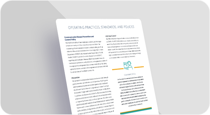 OPERATING PRACTICES, STANDARDS, AND POLICIES Communicable Disease Prevention and Infection Control Control Policy Any BB&N employee diagnosed with a communicable disease such The health and safety of our employees, students, and the larger as COVID-19, H1N1, SARS, chicken pox, measles, tuberculosis, etc., school community is of the utmost importance to BB&N. The must follow the recommended or required protocols by federal, monitoring of communicable diseases is critical to this goal. In an state, and local agencies in connection with absence from and e昀昀ort to follow recommendations from Cambridge Public Health return to work. Recommendations and requirements may include Department (“CPHD”), the Massachusetts Department of Public self-quarantine for a prescribed period of time. BB&N reserves the Health (“MDPH”) and the Center for Disease Control (“CDC”) right to exclude individuals from school and to reassign or change regarding communicable illnesses, BB&N has adopted measures an employee’s duties to cover absences, if necessary. that focus on prevention, early detection, and appropriate control of the exposure to and spread of any communicable illness. By taking a proactive stance, we aim to limit exposure and increase protection for all members of the BB&N community. Prevention The spread of communicable diseases can be controlled through COMMUNICATION good prevention and infection control practices. Hand hygiene In the event of a communicable illness outbreak or and respiratory etiquette are standard precautions. Employees possible exposure to a communicable illness, BB&N should wash hands often with soap and warm water for at least will notify employees. In addition, the Director 20 seconds. Coughs and sneezes should be made into the elbow. of Student Support Services, with assistance from In addition, employees who exhibit 昀氀u-like symptoms should stay the Campus Nurses, will collaborate with the at home and remain at home until such time as is recommended CPHD, the BB&N School Physician, and the BB&N or required by federal, state, and local agencies. This aids in early Administration to implement a communication plan identi昀椀cation and treatment of any ill employees or students. BB&N that best serves the entire BB&N community. Our Nurses work in close collaboration with intra-campus departments goal is to keep the channels of communication open such as facilities, dining services, and athletics in maintaining strict and to alert employees of a potential health problem sanitation procedures that follow federal, state, and local protocol and advise them what to do. and procedures. These prevention measures support the goal of maintaining a healthful environment. - 30 -
