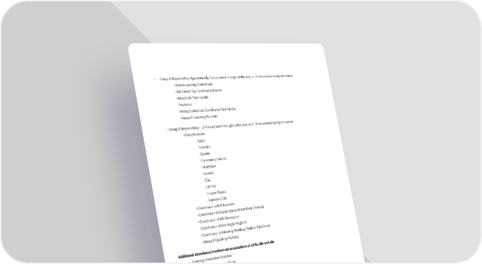 • Group A Responsibility: Approximately 5 hours/week throughout the year, or 15 hours/week during one season. ~Service Learning Coordinator ~MS Global Trip Coordinator/Leader ~Model UN Team Leader ~Yearbook ~Hiring Committee Coordinator/New Faculty ~Group A Coaching Positions • Group B Responsibility: ~ 2-4 hours/week throughout the year, or 6 -10 hours/week during one season ~Clubs/Activities: -Spark -Robotics -Debate -Community Service -MathTeam -Science -Clay -Lit Club -Improv Players -Rainbow Club ~Coordinator of 8-9 Transition ~Coordinator of Display Spaces/MasterDuty Driveway ~Coordinator of MS Orientation ~Coordinator of Girls Angle Programs ~Coordinator of Morning Meetings/Student Role/Voices ~Group B Coaching Positions Additional attendance/involvement expectations of all faculty include: • Opening Orientation Activities • MS Community Ice Cream Social • MS Back to School Night (BTSN) • Weekly Class/ Morning Meetings • CABs/MS Assemblies/Special Events • MS MIX - Chaperones • BB&N Grade 6-8 Fall Sports Fest • Teacher Conference Days/ Zoom -Day #1,(1pm-7:15pm), Day #2 (7:30am - 2pm) • Community Days throughout the year • MS/ Grade speci昀椀c Field Trips Chaperone • All MS Faculty meetings: Tuesday morning and Wednesday afternoons. • All Department meetings • All Grade Level/TEAM meetings • All-school professional days (August, October, February, June) • Afternoon all-school meetings four times per year (unless involved in a school obligation, such as coaching ) • Community Grade Night Events/ Performances/Games to support students and colleagues (choose at least 2) • Admissions events (i.e. Open House, revisit days, evening receptions) • MS Closing Ceremonies and US Graduation • Re昀氀ecting upon and preparing for the next school year - 34 -