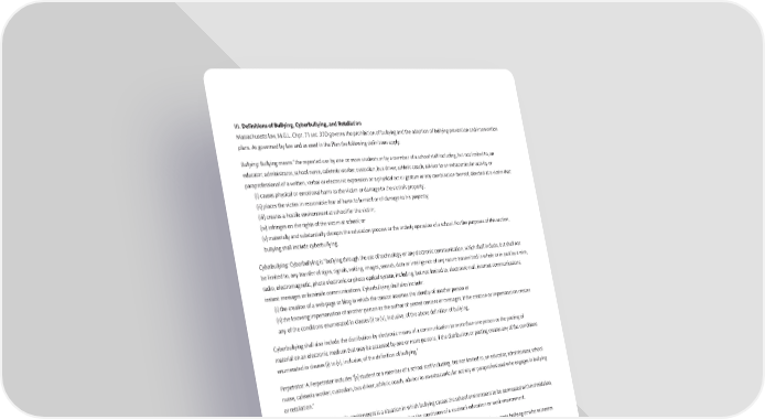 III. De昀椀nitions of Bullying, Cyberbullying, and Retaliation Massachusetts law, M.G.L. Chpt. 71 sec. 37O governs the prohibition of bullying and the adoption of bullying prevention and intervention plans. As governed by law and as used in the Plan the following de昀椀nitions apply: Bullying: Bullying means “the repeated use by one or more students or by a member of a school sta昀昀 including, but not limited to, an educator, administrator, school nurse, cafeteria worker, custodian, bus driver, athletic coach, advisor to an extracurricular activity or paraprofessional of a written, verbal or electronic expression or a physical act or gesture or any combination thereof, directed at a victim that: (i) causes physical or emotional harm to the victim or damage to the victim’s property; (ii) places the victim in reasonable fear of harm to himself or of damage to his property; (iii) creates a hostile environment at school for the victim; (iv) infringes on the rights of the victim at school; or (v) materially and substantially disrupts the education process or the orderly operation of a school. For the purposes of this section, bullying shall include cyberbullying. Cyberbullying: Cyberbullying is “bullying through the use of technology or any electronic communication, which shall include, but shall not be limited to, any transfer of signs, signals, writing, images, sounds, data or intelligence of any nature transmitted in whole or in part by a wire, radio, electromagnetic, photo electronic or photo optical system, including, but not limited to, electronic mail, internet communications, instant messages or facsimile communications. Cyberbullying shall also include: (i) the creation of a web page or blog in which the creator assumes the identity of another person or (ii) the knowing impersonation of another person as the author of posted content or messages, if the creation or impersonation creates any of the conditions enumerated in clauses (i) to (v), inclusive, of the above de昀椀nition of bullying. Cyberbullying shall also include the distribution by electronic means of a communication to more than one person or the posting of material on an electronic medium that may be accessed by one or more persons, if the distribution or posting creates any of the conditions enumerated in clauses (i) to (v), inclusive, of the de昀椀nition of bullying.” Perpetrator: A Perpetrator includes “[a] student or a member of a school sta昀昀 including, but not limited to, an educator, administrator, school nurse, cafeteria worker, custodian, bus driver, athletic coach, advisor to an extracurricular activity or paraprofessional who engages in bullying or retaliation.” Hostile Environment: A hostile environment is a situation in which bullying causes the school environment to be permeated with intimidation, ridicule, or insult that is su昀케ciently severe or pervasive to alter the conditions of a student’s education or work environment. Retaliation: Retaliation is any form of intimidation, reprisal, or harassment directed against a student who reports bullying or who witnesses and/or provides information during an investigation. Legal De昀椀nitions and School Policy: Stricter standards of behavior may apply under the school’s policies to prevent inappropriate verbal and physical conduct before a student has been subject to bullying, cyberbullying, or retaliation as it is de昀椀ned under the law. For example, although the Plan de昀椀nes bullying as “repeated use” of certain expressions, acts, and/or gestures, the school reserves the right to apply disciplinary measures and other corrective/remedial action in a case of a single expression, act or gesture, if the school determines that it is of su昀케cient severity to warrant disciplinary measures or other corrective/remedial action. III. Prevention of Bullying, Cyberbullying, and Retaliation The school’s values, faculty professional development, parent programming, and student support services focuses on the development of a collaborative and safe community in which all members feel welcome and connected. From the moment a student becomes a member of the school community, they learn that as members of our community they have a right to be treated with civility and respect. Our curriculum emphasizes respect for di昀昀erences, and faculty are clear in their expectations for student - 43 -