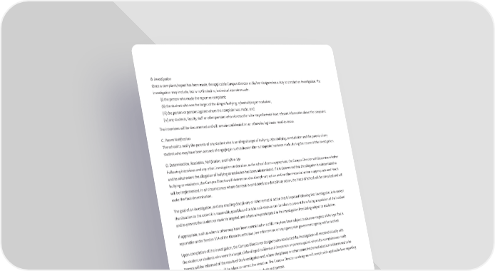 B. Investigation Once a complaint/report has been made, the applicable Campus Director or his/her designee has a duty to conduct an investigation. The investigation may include, but is not limited to, individual interviews with: (i) the person who made the report or complaint; (ii) the student who was the target of the alleged bullying, cyberbullying or retaliation; (iii) the person or persons against whom the complaint was made, and; (iv) any students, faculty, sta昀昀 or other persons who witnessed or who may otherwise have relevant information about the complaint. The interviews will be documented and will remain con昀椀dential on an otherwise legitimate need-to-know. C. Parent Noti昀椀cation The school to notify the parents of any student who is an alleged target of bullying, cyberbullying, or retaliation and the parents of any student who may have been accused of engaging in such behavior after a complaint has been made, during the course of the investigation. D. Determination, Resolution, Noti昀椀cation, and Follow-Up Following interviews and any other investigation undertaken, as the school deems appropriate, the Campus Director will determine whether and to what extent the allegation of bullying or retaliation has been substantiated. If it is determined that the allegation is substantiated as bullying or retaliation, the Campus Director will determine what disciplinary action and/or other remedial action is appropriate and how it will be implemented. In all circumstances where dismissal is considered as a disciplinary action, the Head of School will be consulted and will make the 昀椀nal determination. The goal of an investigation, and any resulting disciplinary or other remedial action that is imposed following that investigation, is to correct the situation to the extent it is reasonably possible and to take such steps as can be taken to prevent there being a repetition of the incident and to prevent the student or students targeted and others who participated in the investigation from being subject to retaliation. If appropriate, such as when a crime may have been committed or a child may have been subject to abuse or neglect of the type that is reportable under Section 51A of the Massachusetts laws, law enforcement or any appropriate government agency will be noti昀椀ed. Upon completion of the investigation, the Campus Director or designee who conducted the investigation will meet individually with the student or students who were the target of the alleged incident and the person or persons against whom the complaint was made. Parents will be informed of the results of the investigation and, where disciplinary or other corrective/remedial action is determined to be appropriate, the steps that will be taken to correct the situation. The Campus Director or designee will comply with applicable laws regarding disclosure of con昀椀dential information when informing students and parents. No disciplinary action may be taken against a person solely on the basis of an anonymous report. The Campus Director or designee who conducted the investigation, in consultation with the school counselor, may refer perpetrators, victims, and family members of such students for counseling or other services as appropriate. The Campus Director will insure that there are check-ins made with any student found to have been targeted in violation of this policy and his/her parents to inquire as to whether there have been any further incidents. The Campus Director will keep a 昀椀le on all reports of bullying, cyberbullying or retaliation, the investigation, and any actions taken in response to a 昀椀nding of bullying, cyberbullying or retaliation. VI. Conclusion BB&N is committed to the prevention of bullying, cyberbullying, and retaliation. This Plan is consistent with our Community Standards and Values that strive to create a safe and welcoming environment for all of our community members.