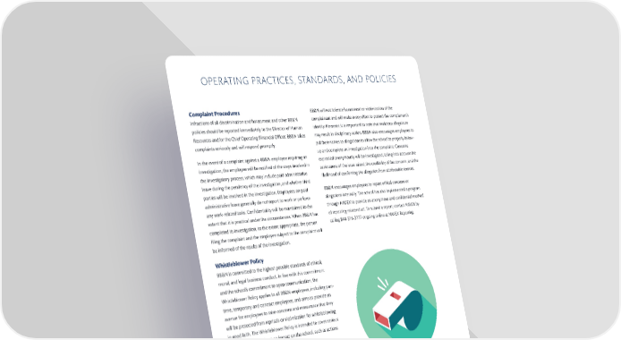 OPERATING PRACTICES, STANDARDS, AND POLICIES Complaint Procedures BB&N will not tolerate harassment or victimization of the Infractions of all discrimination and harassment and other BB&N complainant and will make every e昀昀ort to protect the complainant’s policies should be reported immediately to the Director of Human identity. However, it is important to note that malicious allegations Resources and/or the Chief Operating/Financial O昀케cer. BB&N takes may result in disciplinary action. BB&N also encourages employees to complaints seriously and will respond promptly. put their names to allegations to allow the school to properly follow- up and complete an investigation into the complaint. Concerns In the event of a complaint against a BB&N employee requiring an expressed anonymously will be investigated, taking into account the investigation, the employee will be noti昀椀ed of the steps involved in seriousness of the issue raised, the credibility of the concern, and the the investigatory process, which may include paid administrative likelihood of con昀椀rming the allegation from attributable sources. leave during the pendency of the investigation, and whether third parties will be involved in the investigation. Employees on paid BB&N encourages employees to report ethical concerns or administrative leave generally do not report to work or perform allegations internally. The school has also implemented a program any work-related tasks. Con昀椀dentiality will be maintained to the through NAVEX to provide an anonymous and con昀椀dential method extent that it is practical under the circumstances. When BB&N has of reporting misconduct. To submit a report, contact NAVEX by completed its investigation, to the extent appropriate, the person calling 844-516-3777 or going online at NAVEX Reporting. 昀椀ling the complaint and the employee subject to the complaint will be informed of the results of the investigation. Whistleblower Policy BB&N is committed to the highest possible standards of ethical, moral, and legal business conduct. In line with this commitment and the school’s commitment to open communication, the Whistleblower Policy applies to all BB&N employees, including part- time, temporary, and contract employees, and aims to provide an avenue for employees to raise concerns and reassurance that they will be protected from reprisals or victimization for whistleblowing in good faith. The Whistleblower Policy is intended to cover serious concerns that could have an impact on the school, such as actions that: • May lead to incorrect 昀椀nancial reporting; • Are unlawful; • Are not in line with school policy, including the community standards; • Otherwise amount to serious improper conduct. - 29 -