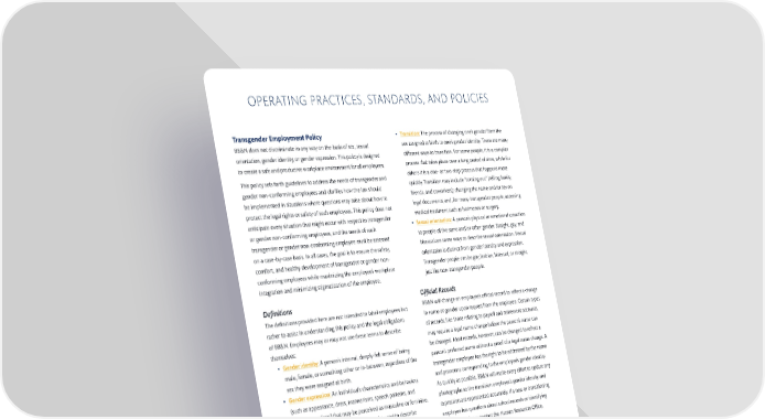 OPERATING PRACTICES, STANDARDS, AND POLICIES Transgender Employment Policy • Transition: The process of changing one’s gender from the BB&N does not discriminate in any way on the basis of sex, sexual sex assigned at birth to one’s gender identity. There are many orientation, gender identity, or gender expression. This policy is designed di昀昀erent ways to transition. For some people, it is a complex to create a safe and productive workplace environment for all employees. process that takes place over a long period of time, while for This policy sets forth guidelines to address the needs of transgender and others it is a one- or two-step process that happens more gender non-conforming employees and clari昀椀es how the law should quickly. Transition may include “coming out” (telling family, be implemented in situations where questions may arise about how to friends, and coworkers); changing the name and/or sex on protect the legal rights or safety of such employees. This policy does not legal documents; and, for many transgender people, accessing anticipate every situation that might occur with respect to transgender medical treatment such as hormones or surgery. or gender non-conforming employees, and the needs of each • Sexual orientation: A person’s physical or emotional attraction transgender or gender non-conforming employee must be assessed to people of the same and/or other gender. Straight, gay, and on a case-by-case basis. In all cases, the goal is to ensure the safety, bisexual are some ways to describe sexual orientation. Sexual comfort, and healthy development of transgender or gender non- orientation is distinct from gender identity and expression. conforming employees while maximizing the employee’s workplace Transgender people can be gay, lesbian, bisexual, or straight, integration and minimizing stigmatization of the employee. just like non-transgender people. De昀椀nitions O昀케cial Records The de昀椀nitions provided here are not intended to label employees but BB&N will change an employee’s o昀케cial record to re昀氀ect a change rather to assist in understanding this policy and the legal obligations in name or gender upon request from the employee. Certain types of BB&N. Employees may or may not use these terms to describe of records, like those relating to payroll and retirement accounts, themselves: may require a legal name change before the person’s name can • Gender identity: A person’s internal, deeply-felt sense of being be changed. Most records, however, can be changed to re昀氀ect a male, female, or something other or in-between, regardless of the person’s preferred name without a proof of a legal name change. A sex they were assigned at birth. transgender employee has the right to be addressed by the name • Gender expression: An individual’s characteristics and behaviors and pronouns corresponding to the employee’s gender identity. (such as appearance, dress, mannerisms, speech patterns, and As quickly as possible, BB&N will make every e昀昀ort to update any social interactions) that may be perceived as masculine or feminine. photographs so the transition employee’s gender identity and • Transgender: An umbrella term that can be used to describe expression are represented accurately. If a new or transitioning people whose gender identity and/or expression is di昀昀erent from employee has questions about school records or identifying their sex assigned at birth. documents, please contact the Human Resources O昀케ce. - A person whose sex assigned at birth was female but who identi昀椀es Names/Pronouns as male is a transgender man (also known as female-to-male An employee has the right to be addressed by the name and transgender person, or FTM). - A person whose sex assigned at birth was male but who pronouns that correspond to the employee’s gender identity, upon identi昀椀es as female is a transgender woman (also known as request. A court-ordered name or gender change is not required. male-to-female transgender person, or MTF). The intentional or persistent refusal to respect an employee’s gender - Some people described by this de昀椀nition do not consider identity (for example, intentionally referring to the employee by themselves transgender – they may use other words, or may a name or pronoun that does not correspond to the employee’s identify simply as a man or woman. A person does not need to gender identity) can constitute harassment and is a violation of this identify as transgender in order for nondiscrimination policies to apply to them. policy. If you are unsure what pronoun a transitioning coworker • Gender non-conforming: This term describes people who have, might prefer, politely ask how they would like to be addressed. or are perceived to have, gender characteristics and/or behaviors that do not conform to traditional or societal expectations. These expectations can vary across cultures and change over time. - 24 -