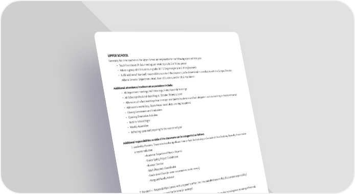 UPPER SCHOOL Generally, full-time teachers in the Upper School are responsible for the following as part of their jobs: • Teach four classes (4 class meetings per week, typically 2 or 3 class preps) • Advise a group of 4-8 students in grades 10-12 (beginning in year 2 of employment) • Ful昀椀ll additional “standard” responsibility outside of the classroom, to be determined in consultation with the Campus Director, Athletic Director, Department Head, Dean of Students, and/or DEIG Practitioner Additional attendance/involvement expectations include: • All department meetings, FACT Meetings, Friday Stand-Up Meetings • All-School professional days (August, October, February, June) • Afternoon all-school meetings four times per year (unless involved in a school obligation, such as coaching or theater rehearsal) • Admissions events (e.g., Open House, revisit days, evening receptions) • Closing Ceremonies and Graduation • Opening Orientation Activities • Back-to-School Night • Weekly Assemblies • Re昀氀ecting upon and preparing for the next school year Additional responsibilities outside of the classroom can be categorized as follows: 1. Leadership Positions: These roles involve signi昀椀cant time on task, both during and outside of the school day. Typically, these involve a course reduction. ~Academic Department Head + Stipend ~Senior Spring Project Coordinator ~Bivouac Director ~Math Placement Coordinator ~Grade Level Dean (in some circumstances; under review) ~Vanguard Faculty Advisor 2. Standard +:- Responsibilities (comes with a stipend to re昀氀ect the time and e昀昀ort beyond that of a standard responsibility) 8-10 hours of work per week for the year (on average) ~Debate ~Category 2 Coaching positions (standard responsibility + coaching; see below for recruiting/non-recruiting di昀昀erential) 3. Standard: Responsibilities include those which represent 3-5 hours of work per week, full year (on average) or 15 hours/week in 1 athletic season ~Service Learning Coordinators (2) - DEIG ~Student Council ~Diversity Steering Committee/Student Diversity Steering Committee - DEIG ~Publication Supervisors (CHASM, POV, Spectator, Society) ~Travel Exchange Coordinator/Global Education Ambassador Program - DEIG ~Robotics Club ~Math Team ~Disciplinary Committee ~GAINS ~Model UN ~French Language Coordinator - 35 -