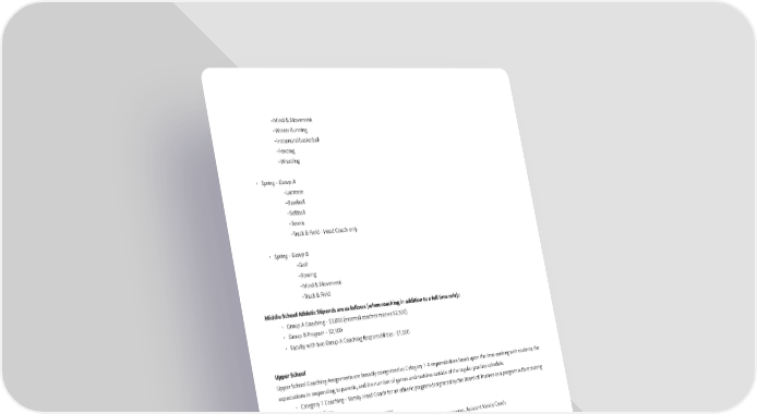 ~Mind & Movement ~Winter Running ~Intramural basketball ~Fencing ~Wrestling • Spring - Group A ~Lacrosse ~Baseball ~Softball ~Tennis ~Track & Field - Head Coach only • Spring - Group B ~Golf ~Rowing ~Mind & Movement ~Track & Field Middle School Athletic Stipends are as follows (when coaching in addition to a full time role):: • Group A Coaching - $3,000 (external coaches receive $2,500) • Group B Program - $2,500 • Faculty with two Group A Coaching Responsibilities - $1,000 Upper School Upper School Coaching Assignments are broadly categorized as Category 1-4 responsibilities based upon the time working with students, the expectations in responding to parents, and the number of games and matches outside of the regular practice schedule. • Category 1 Coaching - Varsity Head Coach for an athletic program designated by the Board of Trustees as a program with recruiting responsibilities. ~Stipend range: $12,500 to $14,500 • Category 2 Coaching - Varsity Head Coach of non-designated recruiting programs, Assistant Varsity Coach ~Stipend range: $3,000 to $8,500 • Category 3 Coaching - JV or Thirds Head Coach and Assistant Coaches ~Stipend range: $2,000 to $6,000 • Category 4 Athletics Duty - Athletic Activities leader or program supporter ~Stipend range: $2,500 to $4,000 - 37 -