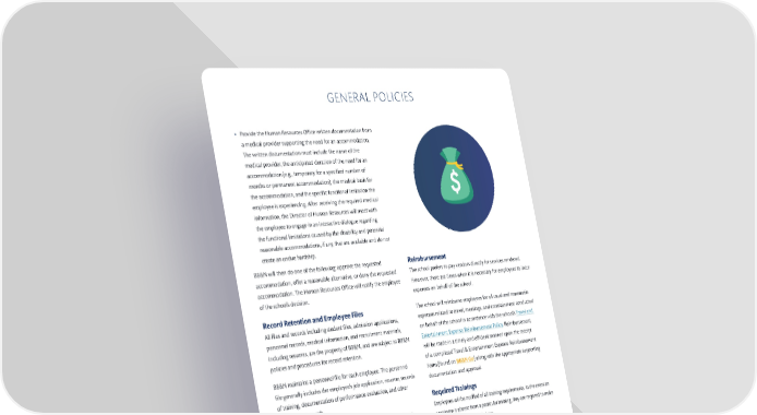 GENERAL POLICIES • Provide the Human Resources O昀케ce written documentation from a medical provider supporting the need for an accommodation. The written documentation must include the name of the medical provider, the anticipated duration of the need for an accommodation (e.g., temporary for a speci昀椀ed number of months or permanent accommodation), the medical basis for the accommodation, and the speci昀椀c functional limitation the employee is experiencing. After receiving the required medical information, the Director of Human Resources will meet with the employee to engage in an interactive dialogue regarding the functional limitations caused by the disability and potential reasonable accommodations, if any, that are available and do not create an undue hardship. BB&N will then do one of the following: approve the requested Reimbursement accommodation, o昀昀er a reasonable alternative, or deny the requested The school prefers to pay vendors directly for services rendered. accommodation. The Human Resources O昀케ce will notify the employee However, there are times when it is necessary for employees to incur of the school’s decision. expenses on behalf of the school. Record Retention and Employee Files The school will reimburse employees for all usual and reasonable All 昀椀les and records including student 昀椀les, admission applications, expenses related to travel, meetings, and entertainment conducted personnel records, medical information, and recruitment materials, on behalf of the school in accordance with the school’s Travel and including resumes, are the property of BB&N, and are subject to BB&N Entertainment Expense Reimbursement Policy. Reimbursement policies and procedures for record retention. will be made in a timely and e昀케cient manner upon the receipt of a completed Travel & Entertainment Expense Reimbursement BB&N maintains a personnel 昀椀le for each employee. The personnel Form (found on BB&N Go) along with the appropriate supporting 昀椀le generally includes the employee’s job application, resume, records documentation and approval. of training, documentation of performance evaluation, and other employment records. Required Trainings Employees will be noti昀椀ed of all training requirements. In the event an Employees who wish to review and/or obtain a copy of their own employee is absent from a particular training, they are required to make personnel 昀椀le must submit a written request to the Human Resources up the session in a timely fashion. O昀케ce. Within 5 business days following the receipt of a written request, an employee may review their personnel 昀椀le at BB&N’s o昀케ces and/or Separation from Employment obtain a paper or digital copy of their personnel 昀椀le. An employee may Upon separation from employment at the school, all BB&N property request access to personnel records no more than twice per calendar must be immediately returned to the appropriate department. Examples year. If an employee does not agree with information included within of BB&N property include, but are not limited to, access cards, keys, their personnel 昀椀le, they may submit a written statement to the 昀椀le laptops, school parking tags, and cell phones. Typically, non-faculty email explaining their position. and voicemail accounts will be closed upon separation. - 21 -