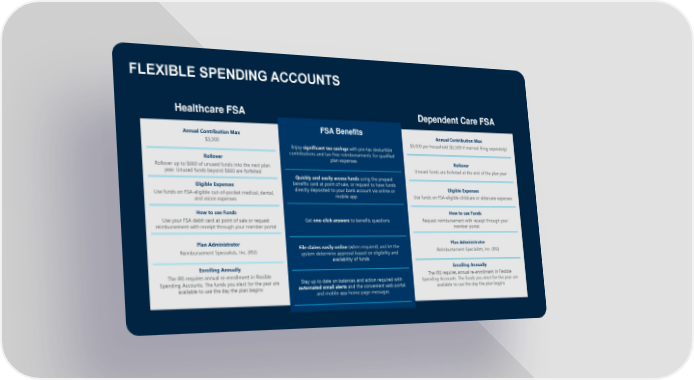 FLEXIBLE SPENDING ACCOUNTS Annual Contribution Max $3,300 Rollover Rollover up to $660 of unused funds into the next plan year. Unused funds beyond $660 are forfeited Eligible Expenses Use funds on FSA-eligible out-of-pocket medical, dental, and vision expenses How to use Funds Use your FSA debit card at point of sale or request reimbursement with receipt through your member portal Plan Administrator Reimbursement Specialists, Inc. (RSI) Enrolling Annually The IRS requires annual re-enrollment in Flexible Spending Accounts. The funds you elect for the year are available to use the day the plan begins Healthcare FSA Dependent Care FSA FSA Benefits Annual Contribution Max $5,000 per household ($2,500 if married filing separately) Rollover Unused funds are forfeited at the end of the plan year Eligible Expenses Use funds on FSA-eligible childcare or eldercare expenses How to use Funds Request reimbursement with receipt through your member portal Plan Administrator Reimbursement Specialists, Inc. (RSI) Enrolling Annually The IRS requires annual re-enrollment in Flexible Spending Accounts. The funds you elect for the year are available to use the day the plan begins Enjoy significant tax savings with pre-tax deductible contributions and tax-free reimbursements for qualified plan expenses Quickly and easily access funds using the prepaid benefits card at point of sale, or request to have funds directly deposited to your bank account via online or mobile app Get one-click answers to benefits questions File claims easily online (when required) and let the system determine approval based on eligibility and availability of funds Stay up to date on balances and action required with automated email alerts and the convenient web portal and mobile app home page messages