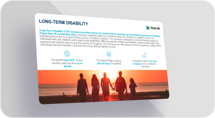 LONG-TERM DISABILITY Long-Term Disability (LTD) insurance provides income to workers whose earnings are interrupted by periods of disability longer than 90 consecutive days. Long-term disability refers to a condition where an individual is unable to work for an extended period due to a severe illness, injury, or medical condition. LTD insurance is designed to provide financial support to individuals who are unable to work due to such disabilities, offering a portion of their pre-disability income to help cover living expenses and medical costs during their period of incapacity. This insurance can offer peace of mind by providing a safety net for individuals and their families in the event of a long-lasting inability to work. This benefit pays 60% of your monthly salary tax-free up to $6,500 Coverage is paid for by your employer and enrollment is automatic This benefit begins paying after 90 days of disability