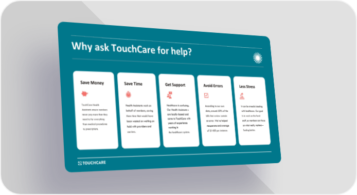 TouchCare Health Assistants ensure members never pay more than they need to for everything from medical procedures to prescriptions. Save Money Health Assistants work on behalf of members, saving them time that would have been wasted on waiting on hold with providers and carriers. Save Time Healthcare is confusing. Our Health Assistants s are locally-based and come to TouchCare with years of experience working in the healthcare system. Get Support According to our own data, around 50% of the bills that review contain an error. We’ve helped recuperate and average of $1400 per instance. Avoid Errors It can be stressful dealing with healthcare. Our goal is to work on the hard stuff, so members can focus on what really matters – feeling better. Less Stress Why ask TouchCare for help? www. t o u c h c a r e . c o m