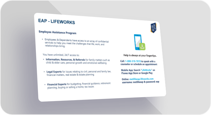 EAP - LIFEWORKS Employee Assistance Program • Employees & Dependents have access to an array of confidential services to help you meet the challenges that life, work, and relationships bring. You have unlimited, 24/7 access to: • Information, Resources, & Referrals for family matters such as child & elder care, personal growth and emotional wellbeing • Legal Experts for issues relating to civil, personal and family law, financial matters, real estate & estate planning • Financial Experts for budgeting, financial guidance, retirement planning, buying or selling a home, tax issues Call: 1-888-319-7819 to speak with a counselor or schedule an appointment Mobile App: Search “LifeWorks” on iTunes App Store or Google Play Online: metlifeeap.lifeworks.com username: metlifeeap & password: eap