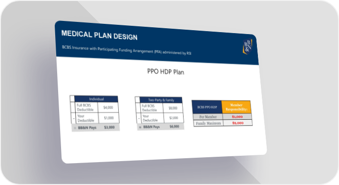 BCBS Insurance with Participating Funding Arrangement (PFA) administered by RSI MEDICAL PLAN DESIGN Individual Full BCBS Deductible $4,000 - Your Deductible $1,000 = BB&N Pays $3,000 Two-Party & Family Full BCBS Deductible $8,000 - Your Deductible $2,000 = BB&N Pays $6,000 PPO HDP Plan BCBS PPO HDP Member Responsibility: Per Member $1,000 Family Maximum $2,000