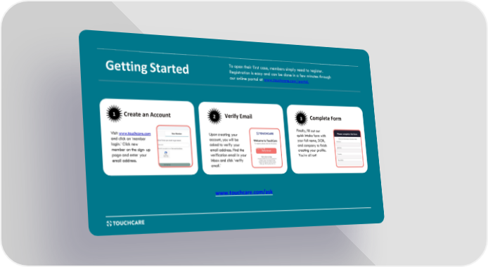 Getting Started To open their first case, members simply need to register. Registration is easy and can be done in a few minutes through our online portal at www.touchcare.com/portal. Verify Email Complete Form Visit www.touchcare.com and click on ‘member login.’ Click new member on the sign- up page and enter your email address. Upon creating your account, you will be asked to verify your email address. Find the verification email in your inbox and click ‘verify email.’ Finally, fill out our quick intake form with your full name, DOB, and company to finish creating your profile. You’re all set! www.touchcare.com/ask www. t o u c h c a r e . c o m 1 9 1 Create an Account 2 3
