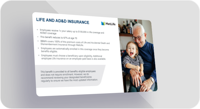 LIFE AND AD&D INSURANCE + Employees receive 1x your salary up to $100,000 in life coverage and AD&D coverage + This benefit reduces to 67% at age 70 + BB&N covers 100% of the premium costs of Life and Accidental Death and Dismemberment Insurance through MetLife. + Employees are automatically enrolled in this coverage once they become benefits eligible. + Employees must choose a beneficiary upon eligibility. Additional employee Life insurance on an employee-paid basis is also available. This benefit is provided to all benefits-eligible employees and does not require enrollment. However, we do recommend reviewing your designated beneficiaries regularly to ensure we have the most updated information.