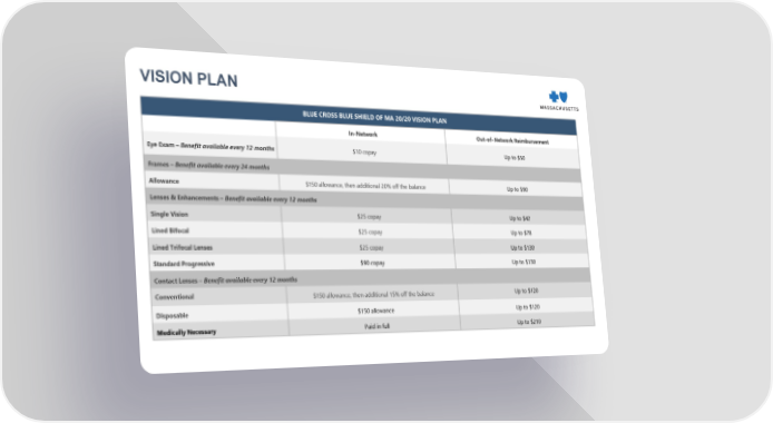 BLUE CROSS BLUE SHIELD OF MA 20/20 VISION PLAN In-Network Out-of-Network Reimbursement Eye Exam – Benefit available every 12 months $10 copay Up to $50 Frames – Benefit available every 24 months Allowance $150 allowance, then additional 20% off the balance Up to $90 Lenses & Enhancements – Benefit available every 12 months Single Vision $25 copay Up to $42 Lined Bifocal $25 copay Up to $78 Lined Trifocal Lenses $25 copay Up to $130 Standard Progressive $90 copay Up to $130 Contact Lenses – Benefit available every 12 months Conventional $150 allowance, then additional 15% off the balance Up to $120 Disposable $150 allowance Up to $120 Medically Necessary Paid in full Up to $210 VISION PLAN