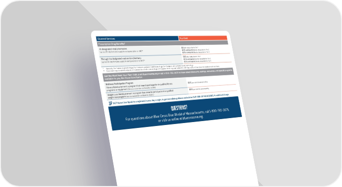 Covered Services Your Cost Prescription Drug Benefits* At designated retail pharmacies (up to a 30-day formulary supply for each prescription or refill)** $15 after deductible for Tier 1 50% coinsurance after deductible for Tier 2 50% coinsurance after deductible for Tier 3 Through the designated mail service pharmacy (up to a 90-day formulary supply for each prescription or refill)** $30 after deductible for Tier 1 50% coinsurance after deductible for Tier 2 50% coinsurance after deductible for Tier 3 * Generally, Tier 1 refers to generic drugs; Tier 2 refers to preferred brand-name drugs; Tier 3 refers to non-preferred brand-name drugs. ** Cost share may be waived, reduced, or increased for certain covered drugs and supplies. Retail drugs are available in a 90-day supply at three times the standard retail cost share. ® Registered Marks of the Blue Cross and Blue Shield Association. © 2025 Blue Cross and Blue Shield of Massachusetts, Inc., or Blue Cross and Blue Shield of Massachusetts HMO Blue, Inc. Printed at Blue Cross and Blue Shield of Massachusetts, Inc. 003558607 (4/25) JB Questions? For questions about Blue Cross Blue Shield of Massachusetts, call 1-800-782-3675, or visit us online at bluecrossma.org. Limitations and Exclusions. These pages summarize the benefits of your health care plan. Your subscriber certificate and riders define the full terms and conditions in greater detail. Should any questions arise concerning benefits, the subscriber certificate and riders will govern. Some of the services not covered are: cosmetic surgery; custodial care; most dental care; and any services covered by workers’ compensation. For a complete list of limitations and exclusions, refer to your subscriber certificate and riders. Get the Most from Your Plan: Visit us at bluecrossma.org or call 1-800-782-3675 to learn about discounts, savings, resources, and special programs available to you, like those listed below. Wellness Participation Program Fitness Reimbursement: a program that rewards participation in qualified fitness programs or equipment (See your subscriber certificate for details.) $150 per calendar year per policy Weight Loss Reimbursement: a program that rewards participation in a qualified weight loss program (See your subscriber certificate for details.) $150 per calendar year per policy 24/7 Nurse Line: Speak to a registered nurse, day or night, to get immediate guidance and advice. Call 1-888-247-BLUE (2583). No additional charge.