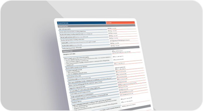 Covered Services Your Cost Preventive Care Well-child care exams Nothing, no deductible Routine adult physical exams, including related tests Nothing, no deductible Routine GYN exams, including related lab tests (one per calendar year) Nothing, no deductible Mental health wellness exams (at least one per calendar year) Nothing, no deductible Routine hearing exams, including routine tests Nothing, no deductible Hearing aids (up to $2,000 per ear every 36 months for a member age 21 or younger) All charges beyond the maximum after deductible Routine vision exams (one every 24 months) Nothing, no deductible Family planning services—office visits Nothing, no deductible Outpatient Care Emergency room visits $750 per visit after deductible (copayment waived if admitted or for observation stay) Office or health center visits, when performed by: • Your PCP, OB/GYN physician, nurse midwife, limited services clinic, or by a physician assistant or nurse practitioner designated as primary care $50 per visit after deductible • Other covered providers, including a physician assistant or nurse practitioner designated as specialty care $75 per visit after deductible Mental health or substance use treatment $50 per visit after deductible Outpatient telehealth services • With a covered provider Same as in-person visit • With the designated telehealth vendor $50 per visit after deductible Chiropractors’ office visits $75 per visit after deductible Acupuncture visits (up to 12 visits per calendar year) $75 per visit after deductible Short-term rehabilitation therapy—physical and occupational (up to 60 visits per calendar year*) $75 per visit after deductible Speech, hearing, and language disorder treatment—speech therapy $75 per visit after deductible Diagnostic x-rays and lab tests Nothing after deductible CT scans, MRIs, PET scans, and nuclear cardiac imaging tests $1,000 per category per service date after deductible Home health care and hospice services Nothing after deductible Oxygen and equipment for its administration Nothing after deductible Durable medical equipment—such as wheelchairs, crutches, hospital beds 20% coinsurance after deductible** Prosthetic devices 20% coinsurance after deductible Surgery and related anesthesia in an office or health center, when performed by: • Your PCP, OB/GYN physician, nurse midwife, or by a physician assistant or nurse practitioner designated as primary care $50 per visit*** after deductible • Other covered providers, including a physician assistant or nurse practitioner designated as specialty care $75 per visit*** after deductible Surgery and related anesthesia in an ambulatory surgical facility, hospital outpatient department, or surgical day care unit $1,000 per admission after deductible Inpatient Care (including maternity care) General or chronic disease hospital care (as many days as medically necessary) $1,000 per admission after deductible Mental hospital or substance use facility care (as many days as medically necessary) $1,000 per admission after deductible Rehabilitation hospital care (up to 60 days per calendar year) $1,000 per admission after deductible Skilled nursing facility care (up to 100 days per calendar year) $1,000 per admission after deductible * No visit limit applies when short-term rehabilitation therapy is furnished as part of covered home health care or for the treatment of autism spectrum disorders. ** Cost share waived for one breast pump per birth, including supplies. *** Copayment waived for restorative dental services and orthodontic treatment or prosthetic management therapy for members under age 18 to treat conditions of cleft lip and cleft palate.