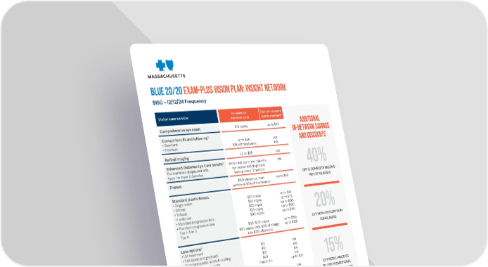 For costs and further details about the coverage, including exclusions, refer to your member booklet. 1. Your actual expenses for covered services may exceed the stated out-of-network amount. 2. Indicates a service that is a discounted arrangement as part of your vision plan. 3. Consult with your eye care provider. 4. Discount applies to materials only and not to fittings for contact lenses. Blue Cross Blue Shield of Massachusetts is an Independent Licensee of the Blue Cross and Blue Shield Association. 40% OFF A COMPLETE SECOND PAIR OF GLASSES 20% OFF NON-PRESCRIPTION SUNGLASSES 15% OFF RETAIL PRICE OR 5% OFF PROMOTIONAL PRICE FOR LASER VISION CORRECTION THROUGH U.S. LASER NETWORK Additional in-network savings and discounts BLUE 20/20 Exam-PLUS Vision Plan: Insight Network $150 - 12/12/24 Frequency Blue 20/20 is administered by EyeMed Vision Care® ́, an independent company. Vision care service In-network member cost Out-of-network reimbursement 1 Comprehensive eye exam $10 copay up to $50 Contact lens fit and follow-up 2 • Standard • Premium up to $40 10% off retail price n/a n/a Retinal imaging up to $39 n/a Enhanced Diabetes Eye Care Benefit 3 For members diagnosed with type 1 or type 2 diabetes Paid in full: up to two diabetic eye exams and diagnostic testing every 12 months n/a Frames $150 allowance, then additional 20% off the balance up to $90 Standard plastic lenses • Single vision • Bifocal • Trifocal • Lenticular • Standard progressive lens • Premium progressive lens Tier 1–Tier 3 Tier 4 $25 copay $25 copay $25 copay $25 copay $90 copay $110–$135 copay $90 copay, then 80% of charge less $120 allowance up to $42 up to $78 up to $130 up to $130 up to $140 up to $196 up to $196 Lens options 2 • UV treatment • Tint (solid and gradient) • Standard plastic scratch coating • Standard polycarbonate • Standard polycarbonate for covered dependents under age 19 • Standard anti-reflective coating • Premium anti-reflective coating Tier 1–Tier 2 • Photochromic/Transitions® ́ plastic • Polarized • Other add-ons $15 $15 $15 $40 Paid in full $45 $57 - $68 $75 20% off retail price 20% off retail price n/a n/a n/a n/a up to $26 n/a n/a n/a n/a n/a Contact lenses 4 • Conventional • Disposable • Medically necessary $150 allowance, then additional 15% off the balance $150 allowance Paid in full up to $120 up to $120 up to $210 Frequency • Exam • Lenses for frames or one order of contact lenses • Frames once every 12 months once every 12 months once every 24 months