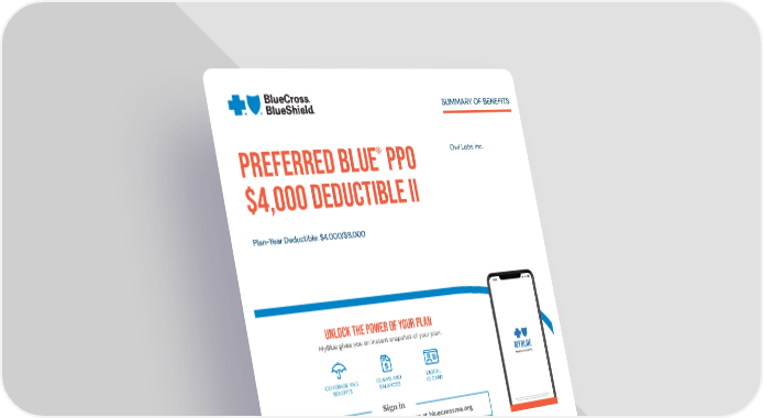 SUMMARY OF BENEFITS ® Owl Labs Inc. Preferred Blue PPO $4,000 Deductible II Plan-Year Deductible: $4,000/$8,000 UNLOCK THE POWER OF YOUR PLAN MyBlue gives you an instant snapshot of your plan: COVERAGE AND CLAIMS AND DIGITAL BENEFITS BALANCES ID CARD Sign in Download the app, or create an account at bluecrossma.org. This health plan meets Minimum Creditable Coverage Standards for Massachusetts residents that went into effect January 1, 2014, as part of the Massachusetts Health Care Reform Law. An Association of Independent Blue Cross and Blue Shield Plans
