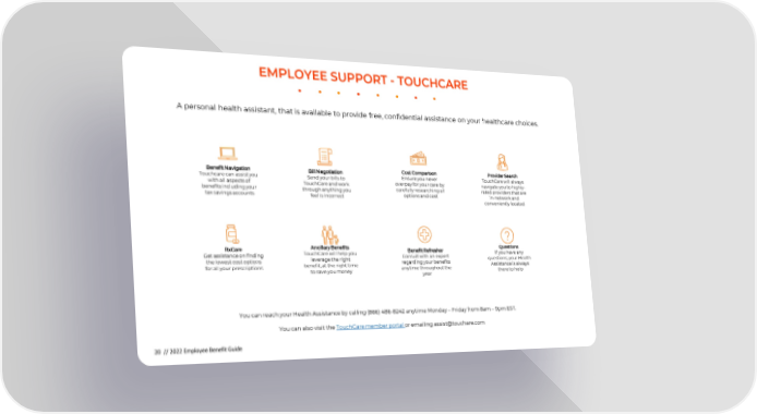EMPLOYEE SUPPORT -TOUCHCARE A personal health assistant, that is available to provide free, confidential assistance on your healthcare choices. Benefit Navigation Bill Negotiation Cost Comparison Provider Search Touchcarecan assist you Send your bills to Ensure you never TouchCare will always with all aspects of TouchCare and work overpay for your care by navigate you to highly- benefits including your through anything you carefully researching all rated providers that are tax savings accounts feel is incorrect options and cost in-network and conveniently located RxCare Ancillary Benefits Benefit Refresher Questions Get assistance on finding TouchCare will help you Consult with an expert If you have any the lowest cost options leverage the right regarding your benefits questions, your Health for all your prescriptions benefit, at the right time anytime throughout the Assistance is always to save you money year there to help You can reach your Health Assistance by calling (866) 486-8242 anytime Monday – Friday from 8am –9pm EST. You can also visit the TouchCare member portal or emailing assist@touchare.com 20 // 2022 Employee Benefit Guide