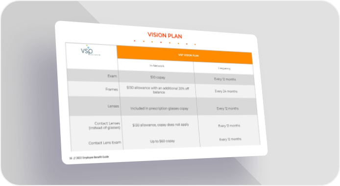 VISION PLAN VSP VISION PLAN In-Network Frequency Exam $10 copay Every 12 months Frames $130 allowance with an additional 20% off Every 24 months balance Lenses Included in prescription glasses copay Every 12 months Contact Lenses $130 allowance, copay does not apply (Instead of glasses) Every 12 months Contact Lens Exam Up to $60 copay Every 12 months 16 // 2022 Employee Benefit Guide