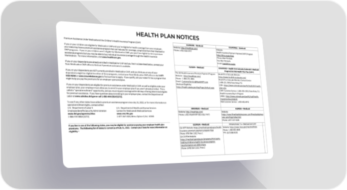 HEALTH PLAN NOTICES Premium Assistance Under Medicaid and the Children’s Health Insurance Program (CHIP) ALABAMA –Medicaid CALIFORNIA –Medicaid Website: http://myalhipp.com/ Website: If you or your children are eligible for Medicaid or CHIP and you’re eligible for health coverage from your employer, Phone: 1-855-692-5447 Health Insurance Premium Payment (HIPP) Program your state may have a premium assistance program that can help pay for coverage, using funds from their Medicaid or http://dhcs.ca.gov/hipp CHIP programs. If you or your children aren’t eligible for Medicaid or CHIP, you won’t be eligible for these premium Phone: 916-445-8322 assistance programs but you may be able to buy individual insurance coverage through the Health Insurance Fax: 916-440-5676 Marketplace. For more information, visit www.healthcare.gov. Email: [email protected] If you or your dependents are already enrolled in Medicaid or CHIP and you live in a State listed below, contact your ALASKA –Medicaid COLORADO –Health First Colorado (Colorado’s Medicaid State Medicaid or CHIP office to find out if premium assistance is available. Program) & Child Health Plan Plus (CHP+) If you or your dependents are NOT currently enrolled in Medicaid or CHIP, and you think you or any of your The AK Health Insurance Premium Payment Program Health First Colorado Website: dependents might be eligible for either of these programs, contact your State Medicaid or CHIP office or dial 1-877- Website: http://myakhipp.com/ https://www.healthfirstcolorado.com/ KIDS NOW or www.insurekidsnow.gov to find out how to apply. If you qualify, ask your state if it has a program that Phone: 1-866-251-4861 Health First Colorado Member Contact Center: might help you pay the premiums for an employer-sponsored plan. Email: [email protected] 1-800-221-3943/ State Relay 711 CHP+: Medicaid Eligibility: https://www.colorado.gov/pacific/hcpf/child-health- If you or your dependents are eligible for premium assistance under Medicaid or CHIP, as well as eligible under your https://health.alaska.gov/dpa/Pages/default.aspx plan-plus employer plan, your employer must allow you to enroll in your employer plan if you aren’t already enrolled. This is CHP+ Customer Service: 1-800-359-1991/ State Relay 711 called a “special enrollment” opportunity, and you must request coverage within 60 days of being determined eligible Health Insurance Buy-In Program for premium assistance. If you have questions about enrolling in your employer plan, contact the Department of (HIBI): https://www.colorado.gov/pacific/hcpf/health- Labor at www.askebsa.dol.gov or call 1-866-444-EBSA (3272). insurance-buy-program To see if any other states have added a premium assistance program since July 31, 2022, or for more information on HIBICustomer Service: 1-855-692-6442 special enrollment rights, contact either: U.S. Department of Labor S U.S. Department of Health and Human Services ARKANSAS –Medicaid FLORIDA –Medicaid Employee Benefits Security Administration Centers for Medicare & Medicaid Services Website: www.dol.gov/agencies/ebsa www.cms.hhs.gov http://myarhipp.com/ Website: 1-866-444-EBSA (3272) 1-877-267-2323, Menu Option 4, Ext. 61565 Phone: 1-855-MyARHIPP (855-692-7447) https://www.flmedicaidtplrecovery.com/flmedicaidtplreco very.com/hipp/index.html ________________________________________________________________________________________________ Phone: 1-877-357-3268 If you live in one of the following states, you may be eligible for assistance paying your employer health plan GEORGIA –Medicaid MASSACHUSETTS –Medicaid and CHIP premiums. The following list of states is current as of July 31, 2022. Contact your State for more information on GA HIPP Website: https://medicaid.georgia.gov/health- https://www.mass.gov/masshealth/pa eligibility – Website: insurance-premium-payment-program-hipp Phone: 1-800-862-4840 Phone: 678-564-1162, Press 1 TTY: (617) 886-8102 GA CHIPRA Website: https://medicaid.georgia.gov/programs/third-party- liability/childrens-health-insurance-program- reauthorization-act-2009-chipra Phone: (678) 564-1162, Press 2
