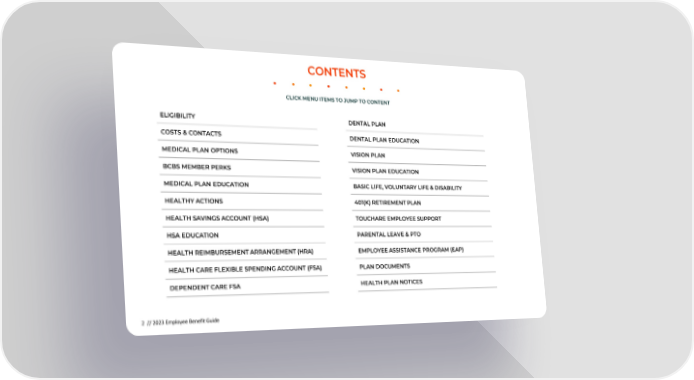 CONTENTS CLICK MENU ITEMS TO JUMP TO CONTENT ELIGIBILITY DENTAL PLAN COSTS & CONTACTS DENTAL PLAN EDUCATION MEDICAL PLAN OPTIONS VISION PLAN BCBS MEMBER PERKS VISION PLAN EDUCATION MEDICAL PLAN EDUCATION BASIC LIFE, VOLUNTARY LIFE & DISABILITY HEALTHY ACTIONS 401(K) RETIREMENT PLAN HEALTH SAVINGS ACCOUNT (HSA) TOUCHARE EMPLOYEE SUPPORT HSA EDUCATION PARENTAL LEAVE & PTO HEALTH REIMBURSEMENT ARRANGEMENT (HRA) EMPLOYEE ASSISTANCE PROGRAM (EAP) HEALTH CARE FLEXIBLE SPENDING ACCOUNT (FSA) PLAN DOCUMENTS DEPENDENT CARE FSA HEALTH PLAN NOTICES 2 // 2023 Employee Benefit Guide