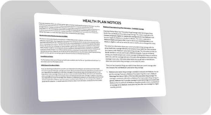 HEALTH PLAN NOTICES If you are covered by FMLA, you will have certain rights to maintain health benefits during the FMLA leave. You will be Medicare Prescription Drug Plan Information – Creditable Coverage notified of any requirement for you to make any premium payments to maintain health benefits and the arrangements for making such payments along with the possible consequences of failure to make such payments on a Important Notice About Your Prescription Drug Coverage Under the Company Group timely basis (i.e., the circumstances under which coverage may lapse) and your potential liability for payment of health insurance premiums paid by the employer during your unpaid FMLA leave if you fail to return to work after Health Plan and Medicare Prescription Drug Coverage: This notice is applicable to the taking FMLA leave. For more information about FMLA, contact the Plan administrator. Company employees eligible for medical plan coverage and who have Medicare or will Genetic Information Nondiscrimination Act (GINA) become eligible for Medicare in the Next 12 Months. This notice is applicable to Medicare eligible participants ONLY. If you or one of your covered dependents is not The Genetic Information Nondiscrimination Act of 2008 (GINA) prohibits employers and other entities covered by Medicare eligible or will not be within the next 12 months, you can disregard this notice. GINA from requesting or requiring genetic information of an individual or family member of the individual, except as specifically allowed by this law. To comply with this law, we are asking that you not provide any genetic information when responding to this request. “Genetic information” as defined by GINA, includes an individual’s family medical This notice has information about your current prescription drug coverage under the history, the results of an individual’s or family member’s genetic tests, the fact that an individual or an individual’s group health plan coverage offered by the Company Group Health Plan (Plan) and about family member sought or received genetic services, and genetic information of a fetus carried by an individual or an your options under Medicare’s prescription drug coverage. This information can help you individual’s family member or an embryo lawfully held by an individual or family member receiving assistive reproductive services. Please do not include any family medical history or any information related to genetic testing, decide whether or not you want to join a Medicare drug plan. If you are considering genetic services, genetic counseling or genetic diseases for which an individual may be at risk. joining, you should compare your current coverage, including which drugs are covered at Grandfathered Status what cost, with the coverage and costs of the plans offering Medicare prescription drug coverage in your area. Information about where you can get help to make decisions The Plan believes that none of the group health plans available under the Plan are “grandfathered health plans” as about your prescription drug coverage is at the end of this notice. described under the Affordable Care Act. HIPAA Special Enrollment Rights There are two important things you need to know about your current coverage under If you are declining enrollment for yourself or your dependents (including your spouse) because of other health the Company Plan and Medicare’s prescription drug coverage: insurance or group health plan coverage, you may be able to enroll yourself and your dependents in this plan if you or your dependents lose eligibility for that other coverage(or if the employer stops contributing toward your or your 1. Medicare prescription drug coverage is available to everyone with Medicare. You can dependents’ other coverage). However, you must request enrollment within 30 days after your or your dependents’ get this coverage if you join a Medicare Prescription Drug Plan or join a Medicare other coverage ends (or after the employer stops contributing toward the other coverage). In addition, if you have a Advantage Plan (like an HMO or PPO) that offers prescription drug coverage. This new dependent as a result of marriage, birth, adoption, or placement for adoption, you may be able to enroll yourself and your dependents. However, you must request enrollment within 30 days after the marriage, birth, adoption, or coverage is sometimes referred to as Medicare Part D prescription drug coverage. In placement for adoption. To request special enrollment or obtain more information, contact the Plan Administrator. general, Medicare Part D provides coverage for prescription drugs not covered under Medicare Part A and Part B. All Medicare drug plans provide at least a standard level of coverage set by Medicare. Some plans may also offer more coverage for a higher monthly premium.