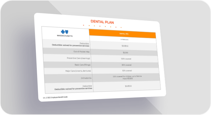 DENTAL PLAN DENTAL PPO In-Network Deductible $50/$150 Deductible waived for preventive services Out-of-Pocket Max $2,000 Preventive Care (cleanings) 100% covered Basic Care (fillings) 80% covered Major Care (crowns, dentures) 50% covered Orthodontia 50% covered for children up to lifetime max of $1,500 Deductible $50/$150 Deductible waived for preventive services 14 // 2022 Employee Benefit Guide