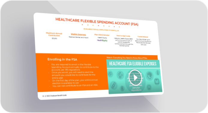 HEALTHCARE FLEXIBLE SPENDING ACCOUNT (FSA) AVAILABLE FOR ALL EMPLOYEES TO ENROLL IN Maximum Annual Eligible Expenses Plan Administrator How to Use Funds Funds Rollover Contribution Medical, Dental, and Vision Health Equity Use your Health Equity debit You may rollover up to $3,050 card at the point of sale, or $610 of unused Healthcare submit receipts for FSA funds into the next reimbursement through the plan year member portal Enrolling in the FSA Watch: Everything You Need to Know About FSAs - You are required to enroll in the Flexible Spending Account annually to contribute to the account, per IRS regulations - Once you enroll, you will need to elect the amount you would like to contribute for the entire year - On the first day of the plan, your entire annual election is available to use - You can not contribute to an FSA and an HSA. 12 // 2022 Employee Benefit Guide