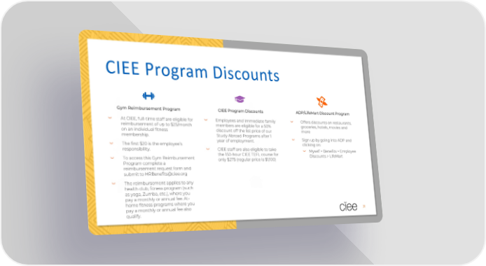 CIEE Program Discounts Gym Reimbursement Program CIEE Program Discounts ADP/LifeMart Discount Program At CIEE, full-time staff are eligible for Employees and immediate family Offers discounts on restaurants, reimbursement of up to $25/month members are eligible for a 50% groceries, hotels, movies and on an individual fitness discount off the list price of our more membership. Study Abroad Programs after 1 Sign up by going into ADP and The first $20 is the employee’s year of employment. clicking on: responsibility. CIEE staff are also eligible to take Myself > Benefits > Employee To access this Gym Reimbursement the 150-hour CIEE TEFL course for Discounts > LifeMart Program complete a only $275 (regular price is $1,100) reimbursement request form and submit to [email protected] The reimbursement applies to any health club, fitness program (such as yoga, Zumba, etc.), where you pay a monthly or annual fee. At- home fitness programs where you pay a monthly or annual fee also qualify. 31