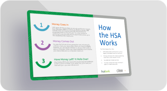 1 Money Goes In How CIEE gives all HSA enrollees an annual contribution towards their HSA plans: $500 to individuals, $1,000 to family. CIEE contributions are made bi-annually and prorated for employees hired during the year. You may contribute additional funds through pre-tax payroll deductions, up to the established IRS maximums. the HSA Money Comes Out Works 2 You pay the full cost of non-preventive care, including Rx, until you meet your deductible. When you have an eligible expense, you can decide whether to use your HSA funds or Tax Advantages of an HSA: pay out of pocket. Either way, these expenses count towards your deductible and out-of-pocket maximum. 1. 100% deductible contributions up to a legally mandated maximum amount 2. Money withdrawn for medical spending Have Money Left? It Rolls Over! never falls under taxable income 3 Any money left in your account is yours to pay for healthcare 3. Tax-deferred interest savings in the future or to invest. If you leave CIEE, you’ll take your 4. Tax-free interest earnings, if money is HSA with you – you own this account. spent on healthcare costs 12