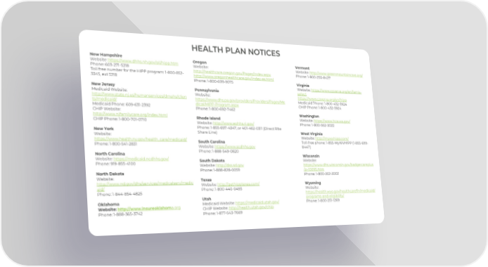 HEALTH PLAN NOTICES New Hampshire Oregon Vermont Website: https://www.dhhs.nh.gov/oii/hipp.htm Website: Phone: 603-271-5218 Website: http://www.greenmountaincare.org/ Phone: 1-800-250-8427 Toll free number for the HIPP program: 1-800-852- http://healthcare.oregon.gov/Pages/index.aspx 3345, ext 5218 http://www.oregonhealthcare.gov/index-es.html Phone: 1-800-699-9075 Virginia https://www.coverva.org/en/famis- New Jersey Website: Pennsylvania Medicaid Website: select http://www.state.nj.us/humanservices/dmahs/clien Website: https://www.coverva.org/en/hipp https://www.dhs.pa.gov/providers/Providers/Pages/Me Medicaid Phone: 1-800-432-5924 ts/medicaid/ dical/HIPP-Program.aspx CHIP Phone: 1-800-432-5924 Medicaid Phone: 609-631-2392 Phone: 1-800-692-7462 CHIP Website: Washington http://www.njfamilycare.org/index.html Rhode Island CHIP Phone: 1-800-701-0710 Website: https://www.hca.wa.gov/ Website: http://www.eohhs.ri.gov/ Phone: 1-800-562-3022 New York Phone: 1-855-697-4347, or 401-462-0311 (Direct RIte Website: Share Line) West Virginia Website: http://mywvhipp.com/ https://www.health.ny.gov/health_care/medicaid/ South Carolina Toll-free phone: 1-855-MyWVHIPP (1-855-699- Phone: 1-800-541-2831 Website: https://www.scdhhs.gov 8447) North Carolina Phone: 1-888-549-0820 Wisconsin Website: https://medicaid.ncdhhs.gov/ South Dakota Website: Phone: 919-855-4100 https://www.dhs.wisconsin.gov/badgercareplus Website: http://dss.sd.gov North Dakota Phone: 1-888-828-0059 /p-10095.htm Website: Phone: 1-800-362-3002 http://www.nd.gov/dhs/services/medicalserv/medic Texas Wyoming aid/ Website: http://gethipptexas.com/ Phone: 1-844-854-4825 Phone: 1-800-440-0493 Website: https://health.wyo.gov/healthcarefin/medicaid/ Oklahoma Utah programs-and-eligibility/ Website: http://www.insureoklahoma.org Medicaid Website: https://medicaid.utah.gov/ Phone: 1-800-251-1269 Phone: 1-888-365-3742 CHIP Website: http://health.utah.gov/chip Phone: 1-877-543-7669