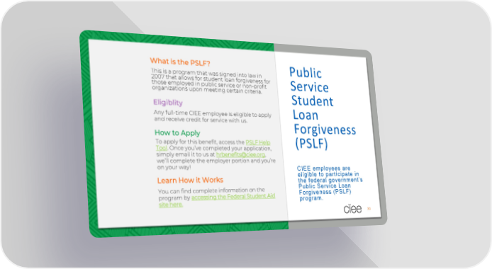 What is the PSLF? Public This is a program that was signed into law in 2007 that allows for student loan forgiveness for those employed in public service or non-profit Service organizations upon meeting certain criteria. Student Eligiblity Any full-time CIEE employee is eligible to apply Loan and receive credit for service with us. Forgiveness How to Apply To apply for this benefit, access the PSLF Help (PSLF) Tool. Once you’ve completed your application, simply email it to us at [email protected], we’ll complete the employer portion and you’re on your way! CIEE employees are Learn How it Works eligible to participate in the federal government’s You can find complete information on the Public Service Loan program by accessing the Federal Student Aid Forgiveness (PSLF) site here. program. 30