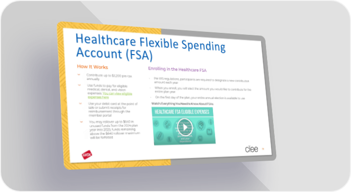 Healthcare Flexible Spending Account (FSA) How It Works Enrolling in the Healthcare FSA Contribute up to $3,200 pre-tax - Per IRS regulations, participants are required to designate a new contribution annually amount each year Use funds to pay for eligible - When you enroll, you will elect the amount you would like to contribute for the medical, dental, and vision entire plan year expenses. You can view eligible expenses here - On the first day of the plan, your entire annual election is available to use Use your debit card at the point of Watch: Everything You Need to Know About FSAs sale or submit receipts for reimbursement through the member portal You may rollover up to $640 in unused funds from the 2024 plan year into 2025; funds remaining above the $640 rollover maximum will be forfeited 19