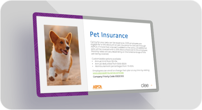 Pet Insurance Caring for your pets can be expensive. CIEE employees are eligible for a 10% discount on pet insurance for one pet through ASPCA. If more than one pet is added to the policy, all additional pets will be covered with a 20% discounted cost to the employee. Monthly rates will vary depending on the breed and age of the pet being covered. Customizable options available: • Annual limit from $3-10k • Annual deductible from $100-$500 • Reimbursement percentages from 70-90% Employees can enroll or change their plan at any time by visiting: www.aspcapetinsurance.com/ciee Company Priority Code: EB22CIEE 23